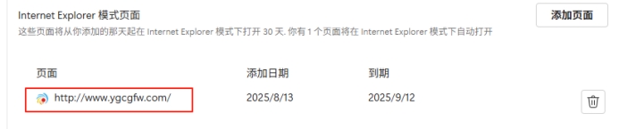 2.点击“默认浏览器”,将右侧“允许在Internet Explorer模式下重新加载网站(IE模式)”设置为“允许”,之后点击“添加”将http://www.ygcgfw.com/网址添加进去。